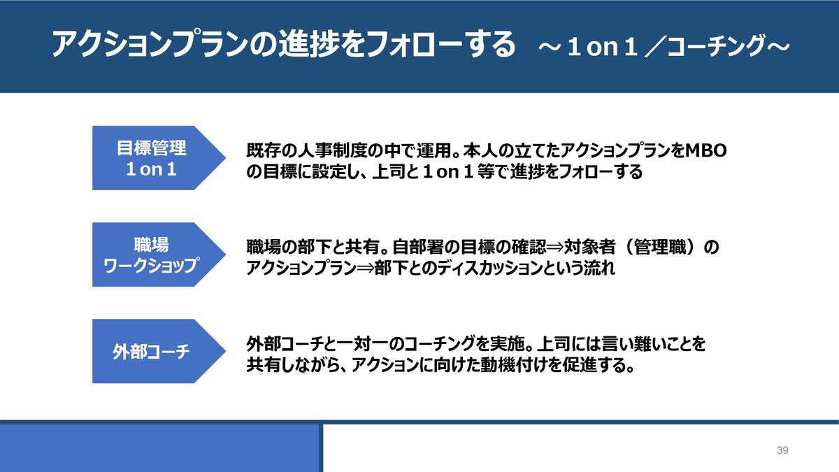文字化したアクションプランをどう展開していくか。進捗をフォローする方法は大きく3つあるかなと思います。1つは、外部コーチと1on1でコーチングしながら、月に1回とか2回、進捗を確認しながら伴走していくやり方です。