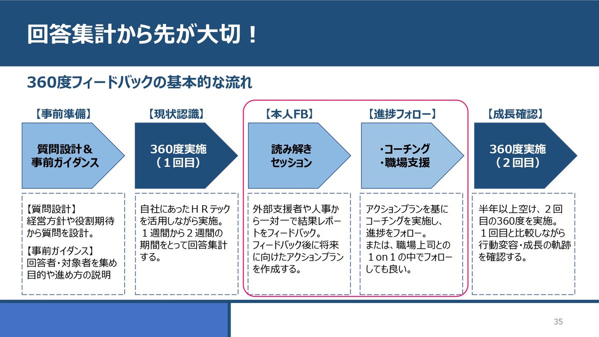 (スライドを示して)これは先ほどもお見せした、360度の基本的な流れです。ご説明したいのは真ん中の、360度の1回目と2回目の間。本人フィードバックと進捗フォローのところになります。ここをどういう風に進めていくかです。