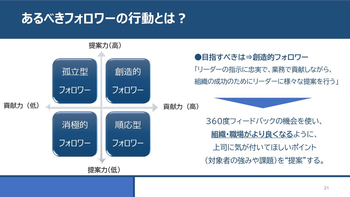 (スライドを示して)縦軸が提案力、横軸が貢献力です。貢献力は、上司から言われたことをフォロワーがきっちりこなしていく力です。縦軸は、ちょっと上司にとっては耳が痛いかもしれないけれどきっちり言わなきゃね、ということだったり。あとは組織のために言うべきだろう、という提案力になります。書籍によっては批判力と訳していることもあります。