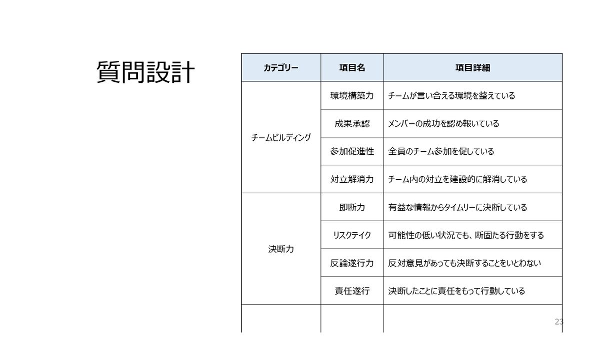 柿沼昌吾氏:(スライドを示して)これは360度フィードバックのカテゴリーになります。例えばリーダーシップ、情報収集、計画遂行、チームワーク、外部研修、ビジョン立案といった項目があった時に、大きくカテゴライズすると、対人関係と業務遂行に分けられるかなと思います。