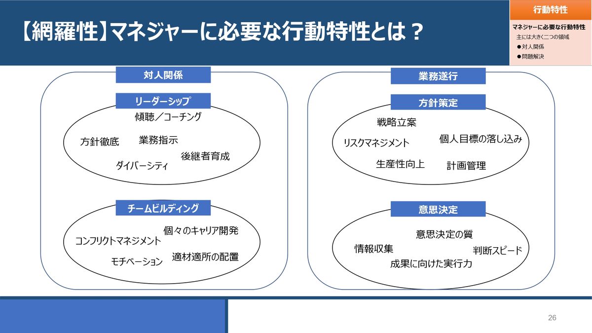 「網羅性」というのは、マネージャーに必要な行動特性、大きく対人関係と業務遂行の2つの領域が網羅的にちゃんとあるかどうかの確認が必要になります。