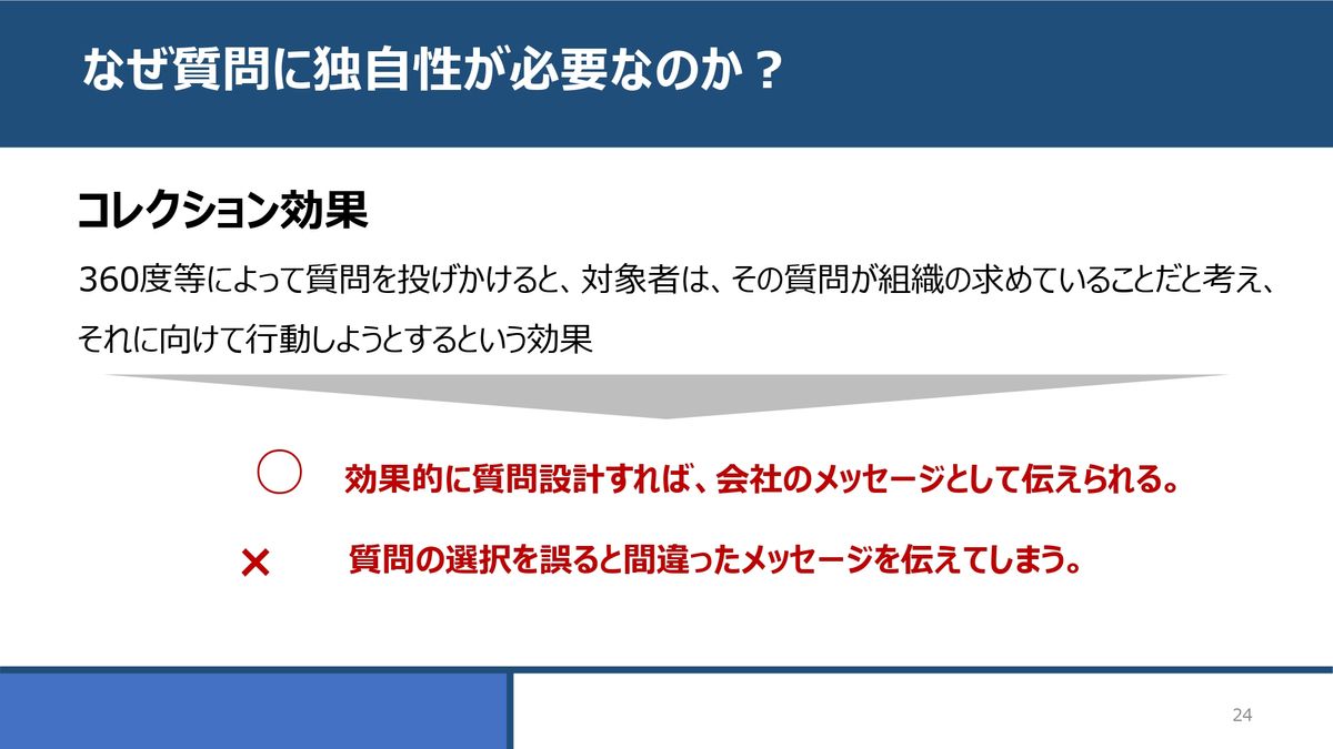そうすると、効果的に設問設計すれば、会社のメッセージとして伝えられるメリットがあります。逆に、ありものの設問を安易に使ってしまうと、間違ったメッセージを伝えてしまう可能性もあるので、コレクション効果を考えると、設問設計をきっちりやったほうがいいかなと思います。