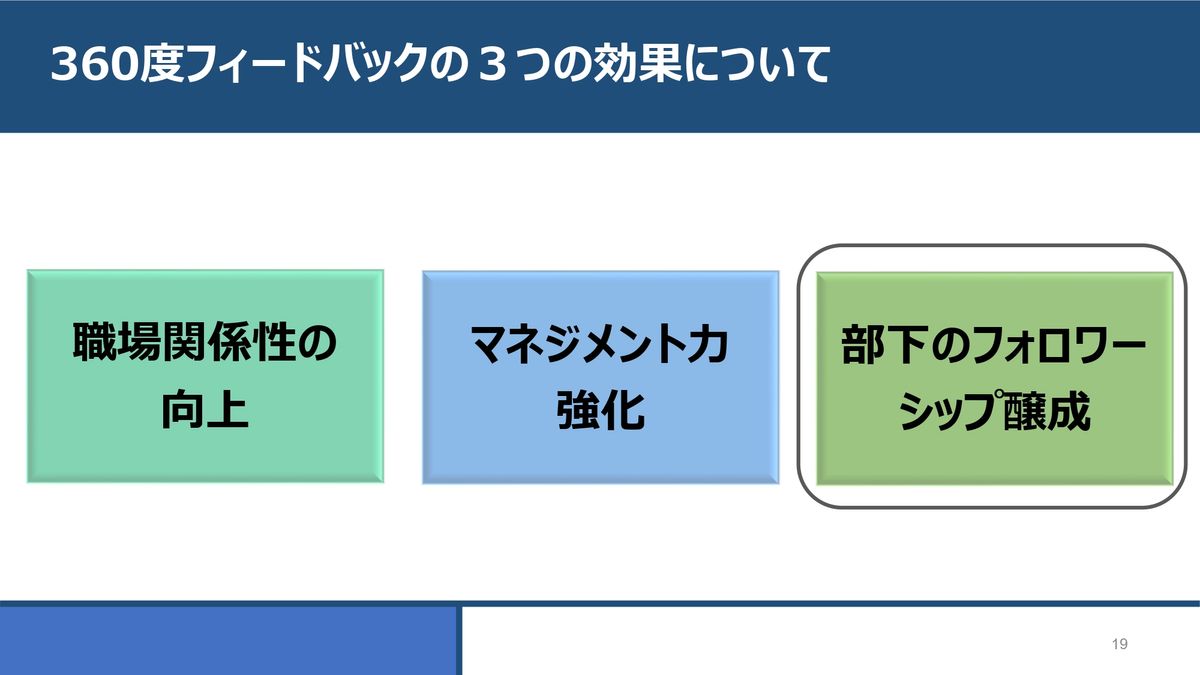 最後は、部下のフォロワーシップ醸成です。これは360度をやることによって、回答者である部下にどういう影響があるかというところになります。