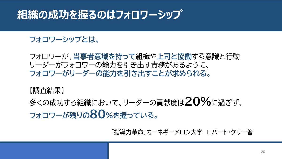 もちろんリーダーがフォロワーの能力を引き出す責務はありますが、それと同時にフォロワーもリーダーの能力を引き出すことが求められる。それをやることで組織はもっと良くなるんだよ、と言っています。調査結果も出ていまして、「多くの成功する組織においてリーダーの貢献度は20パーセントにすぎず、フォロワーが残りの80パーセントを握っている」と言っています。