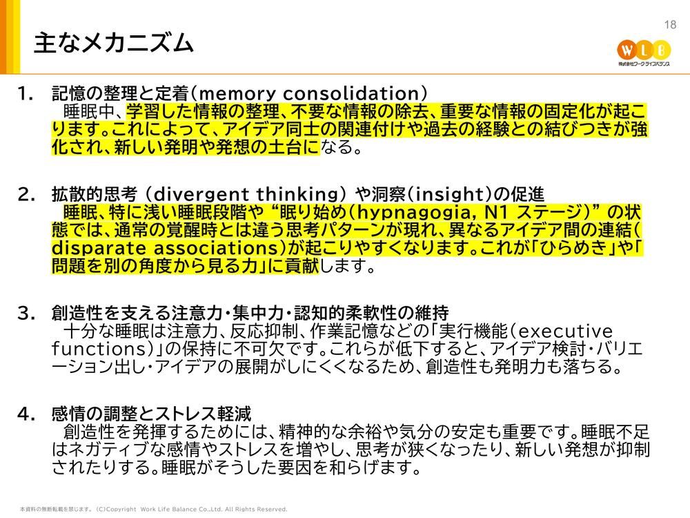 そして2つ目が拡散的思考です。特に眠り始めの浅い睡眠段階の時に、通常の覚醒時とは違う思考パターンが訪れて、それがひらめきになる。3つ目が、創造性を支える注意力・集中力は睡眠によってもたらされるということ。