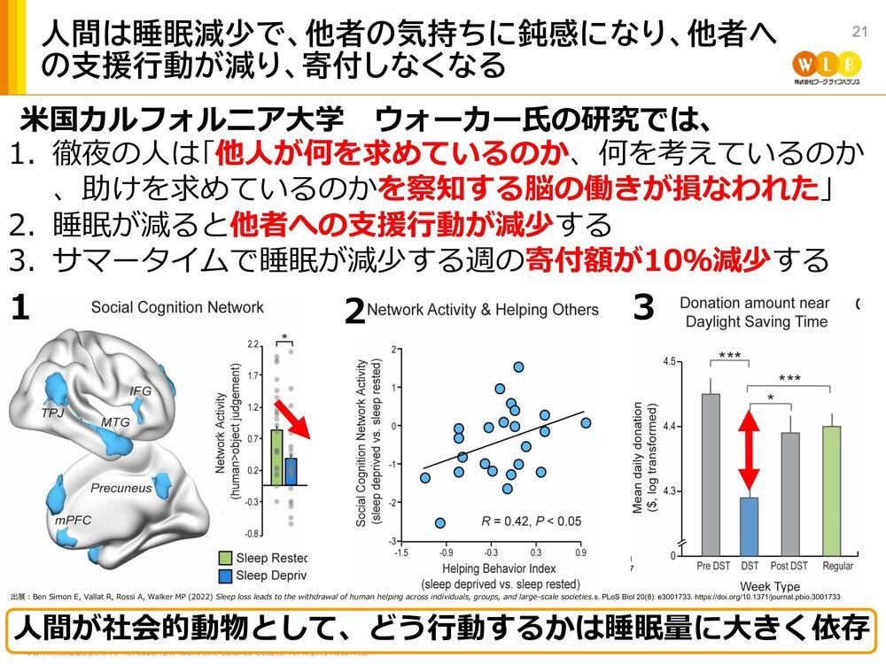 アメリカではサマータイムに睡眠時間が1時間減る週があります。その週に、なんと寄付額が10パーセント減るということがわかっていたんですね。最大の他者支援行動である寄付額が1割減るぐらい、心が狭くなるのが睡眠不足なんです。