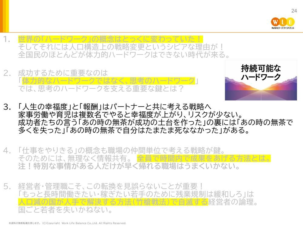 そして最後の項目です。「人生の幸福度やお金だけではない報酬、成功って何か?」ということを考える時に、必ずしも妻・夫だけではないさまざまなパートナーがいると思いますが、自分1人単位だけではなくてパートナー単位で見ていくことが大事かなと思います。