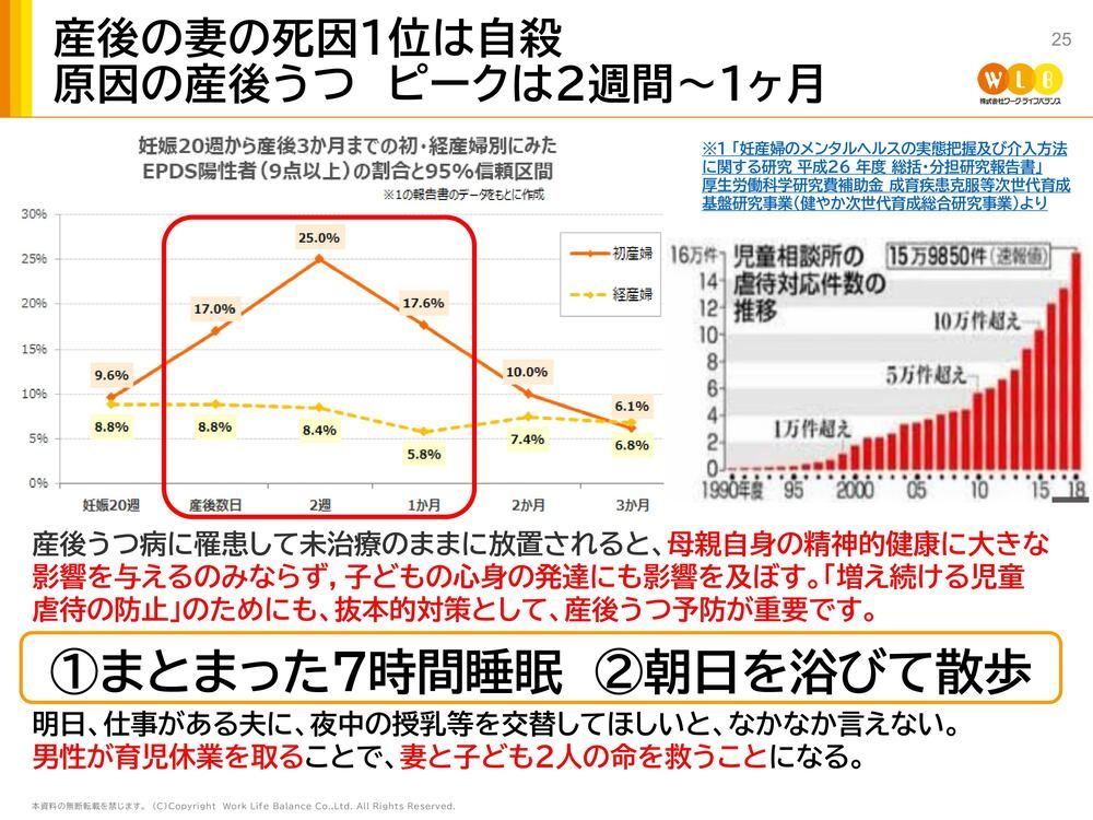 今日は若い方にたくさん受講していただいているので、まさに今、その局面にいらっしゃるかなと思うんですが、産後の妻の死因の1位はなんと自殺であることをご存じでしょうか。出血死でも病死でもなく自殺です。そして、自殺の要因の背景にあるのが産後うつと言われています。