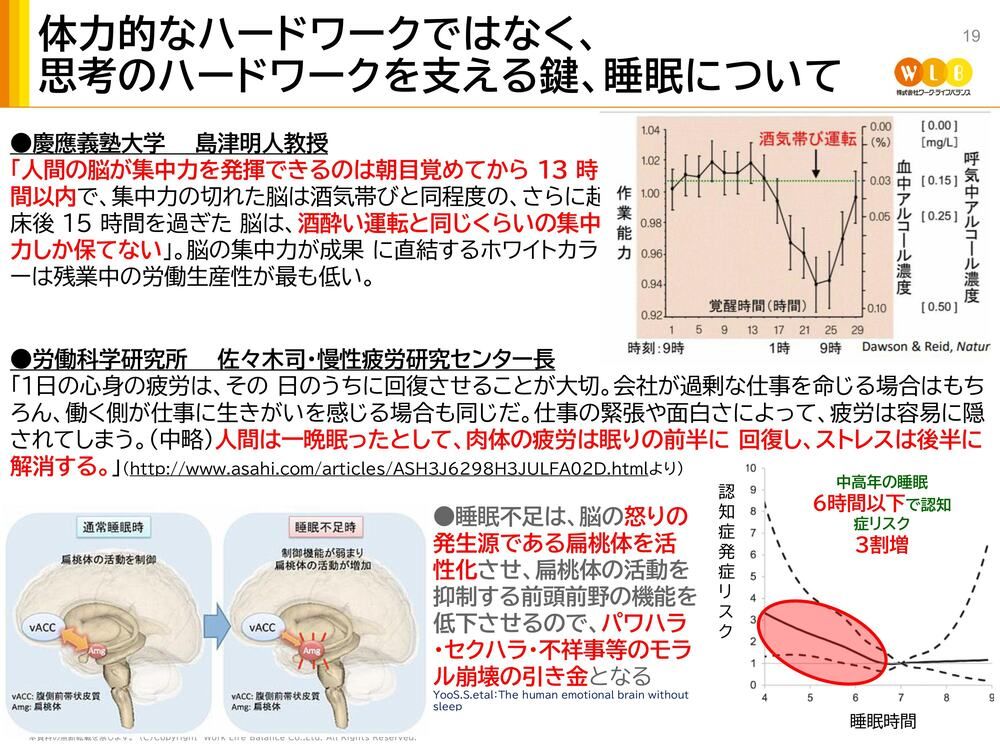 小室淑恵氏:私が特におもしろいと思ったものを(スライドに)2個貼っておきましたが、アメリカの企業を対象に、平均睡眠時間と特許出願数などのイノベーション指標を比較したら、平均睡眠時間が少ない地域の企業では特許出願数が顕著に低くなるというデータが出ました。