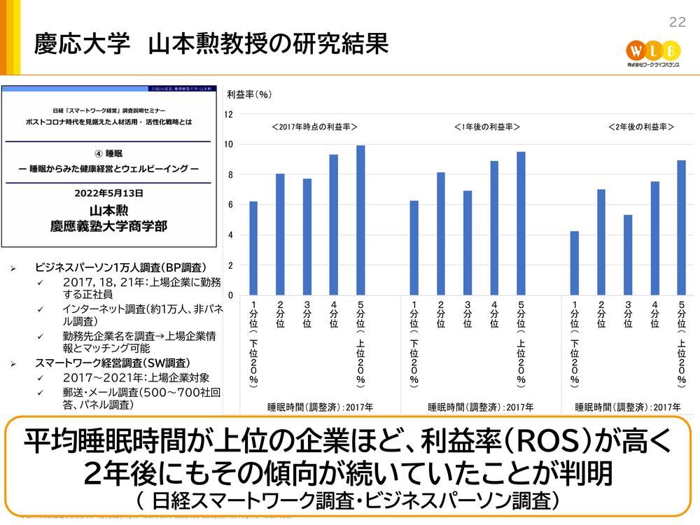 慶應義塾大学の山本勲教授が700社の上場企業を調べたデータによると、睡眠が短い企業よりも長い企業のほうがROS(売上高経常利益率)が高く、それは1年後も2年後も継続していて、2年後はもっと差が開いていたということです。
