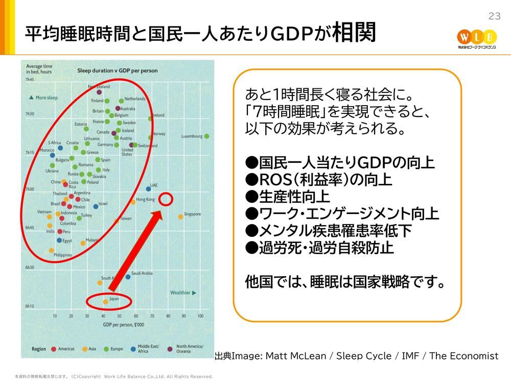 また、私が一番驚いたのがこれだったんですが、縦軸が国民の平均睡眠時間で、横軸が国民1人当たりが稼ぎ出しているGDPです。各国と比較したところ、なんと相関関係にあったということです。ただの相関なんですけれども興味深いですね。日本はこんな異常値みたいなところにありますが、寝ていないわりにはがんばっているということですね(笑)。