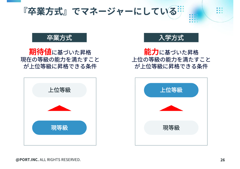 入学方式は、たとえ今の目標がクリアできたとしても、マネジメントのことをちゃんと知った上で「できないのであれば、上にはあげません」というかたちです。これが入学方式に基づいた昇格です。もちろん、それぞれにメリット、デメリットがあります。