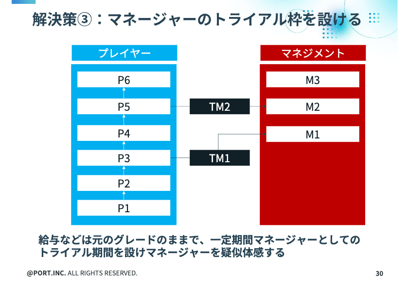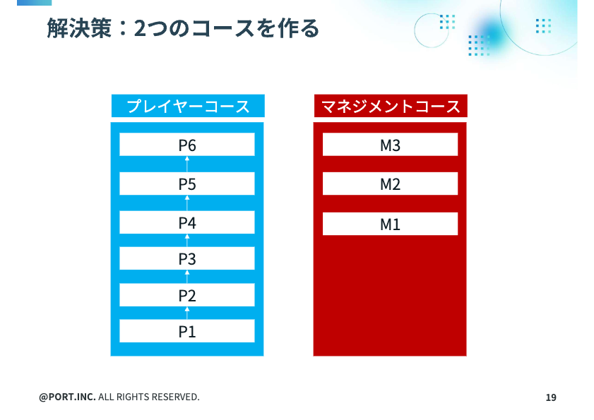 じゃあ、そこに対しての解決策として、どういったことが考えられるのか。よくあるのが、プレイヤーのコースとマネジメントのコースを別に分けて用意する、ですね。