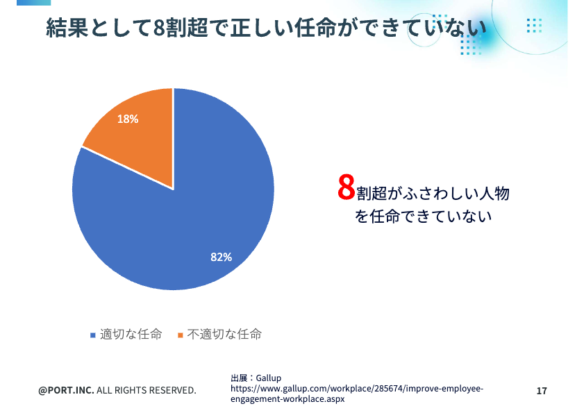 なので「結果を出したその上位職は、基本的にはマネジメントしかない」というルートしかない企業さんが、けっこう失敗をしてしまっていることが多いかなと思っています。実際にこれはデータを取っているのですが、8割ぐらいの方が「正しい人物を任命できていない」と感じているというアンケート結果があります。登用したはいいものの、なかなかうまくいっていないというのが、事実データとしては出ています。