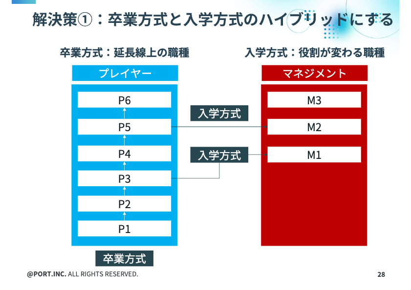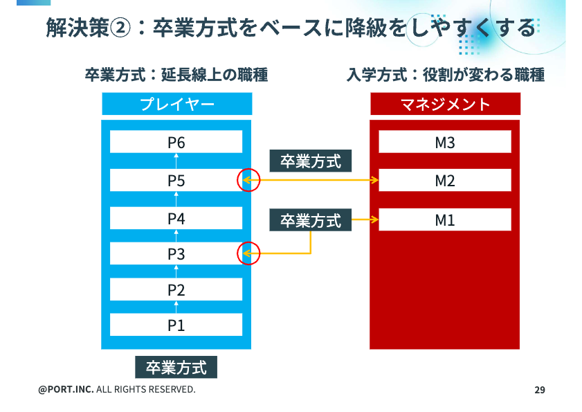 例えば、プレイヤーとして昇格をしていくところ。プレイヤー1からプレイヤー2、プレイヤー2からプレイヤー3。ここはまぁ、卒業方式でどんどん上がっていく感じでいいと思うのですが、例えば「営業から企画に移ります」とか、「同じ営業だけれども、マネジメントに移ります」とか。役割が変わって、例えば部下を持っていくという時は、入学方式というかたちで試験を受けさせたり、そのマネジメントになるための研修を用意して、それを受けないとマネジメントになれないようにする。そういったものを設けてもらうというようなところが、1つのやり方です。