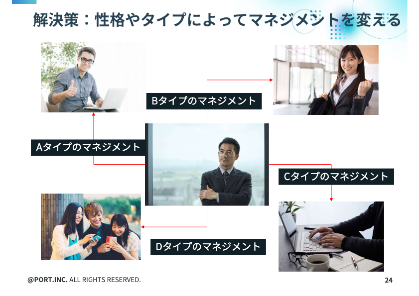 (スライドを示して)真ん中の写真にいる方が仮にマネージャーだと考えた時に、これはAタイプ、Bタイプ、Cタイプ、Dタイプに分けていますが、それぞれぜんぜん違うマネジメントスタイルになってきてしまっています。