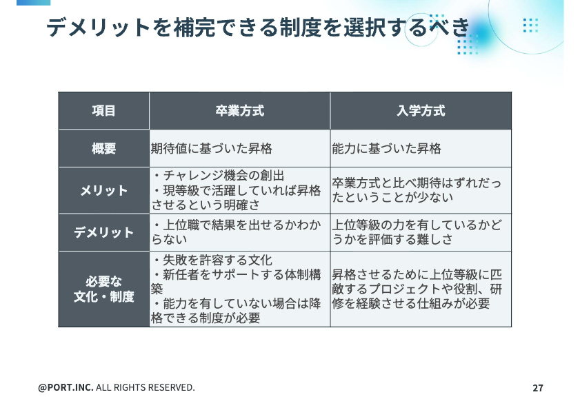 一方でデメリットは、次の職位を任せた時に結果が出せるかどうかが、なかなか難しいというところです。なので、いわゆる「失敗を許容していく」というところだったり、新任マネージャーをちゃんとサポートしていく体制だったり、能力を有していない場合は降格できるとか、こういった文化や制度がどうしても必要です。