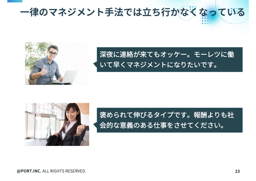 働き方や、価値観が非常に多様化しているという背景ですね。例えばその中で「バンバン働きたいです」「モーレツに働いて、マネジメントになりたいです」みたいな方もいれば、どちらかと言えば褒められて伸びるタイプで「報酬というよりは、自分のやりたいことができているか」とか「社会的に本当にいいことができているか」とかが「大事です」という方もいらっしゃいます。