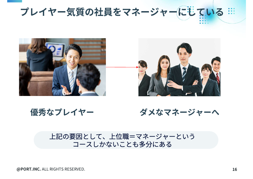 一定ができるようになった上でマネジメントコースに行くというかたちで、1つのルートしかない企業さんもけっこう多く、「結果を出しました! はい、次は上位レイヤー」みたいな感じで管理職になることもあるので、このあたりをそもそも分けて考えるというのが、すごく重要かなと思っています。
