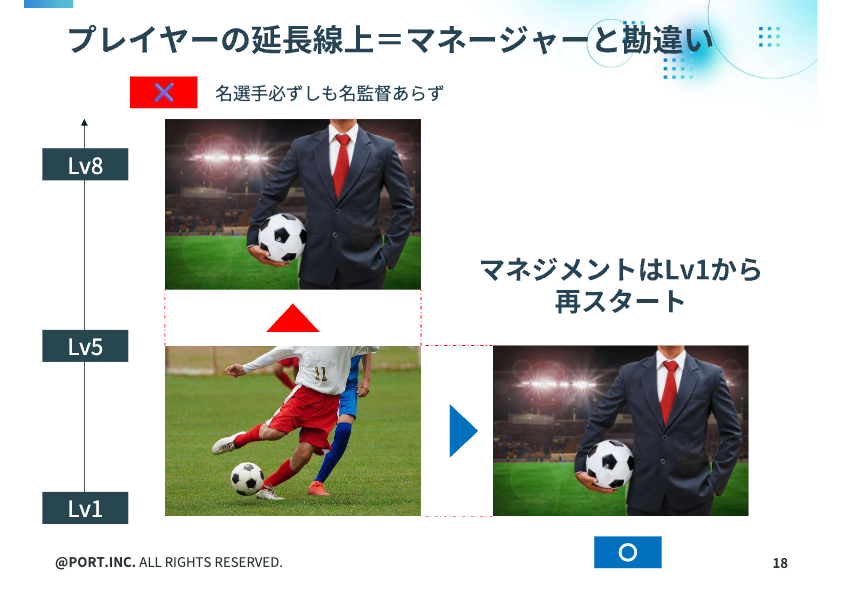 サッカーに例えて図を出していますが、例えばサッカーの名選手が、必ずしも名監督になるかというと、もちろんなる方もいれば、なかなか難しい方もいらっしゃるんですね。