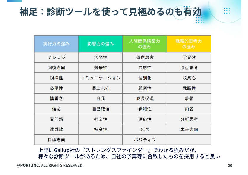 あとは、補足レベルではありますが、例えばストレングスファインダーを活用してみる。「何がその人の強みなのか?」を見ていくと、「この方って、やはりプレイヤーとして磨きをかけていきたいんだな」という思想とか「組織を束ねながら大きい数字をやっていきたい人なのか」というところが、けっこう出てきたりします。
