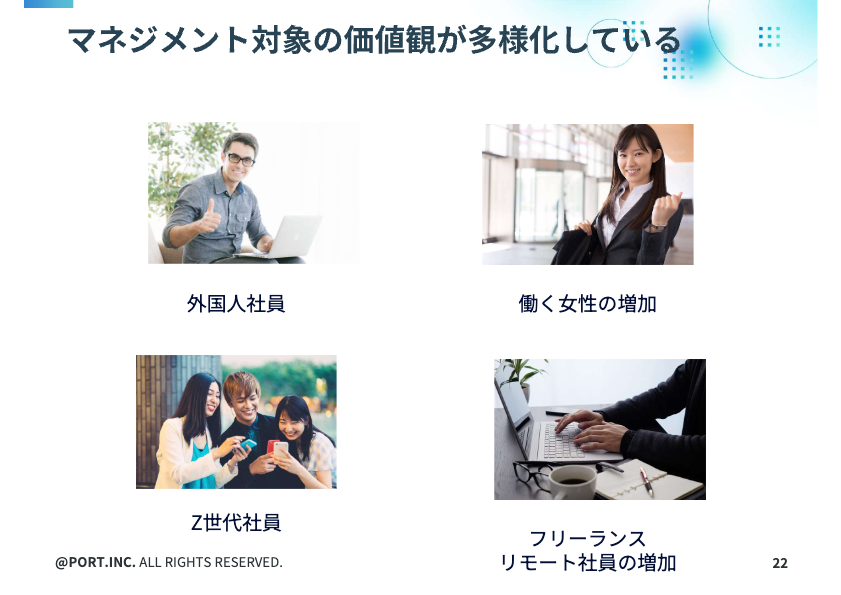 では続いて、Bですね。「一様のマネジメント手法が通用しない」。こちらに関しては、今、昨今いろいろな方々が働いているというところです。例えば海外の方。外国人の社員だったり、働く女性の増加だったり。Z世代の方が、いよいよ入ってきたり。あとはフリーランスだったり、リモート社員の増加だったり。