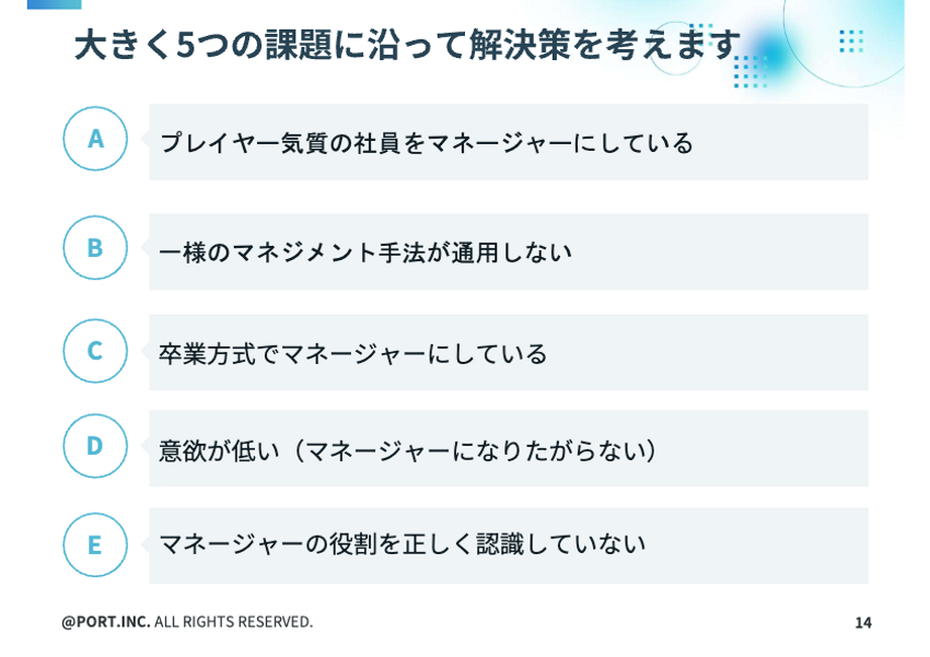 滝澤亮太氏:では、まずAのところですね。「プレイヤー気質の社員をマネージャーにしている」というところからお話しします。企業さまに聞いていると、「営業で結果を出したらマネージャーになります」みたいなことが多くありますが、優秀なプレイヤーが、残念ながらダメなマネージャーになっちゃうということも、実際にはあります。