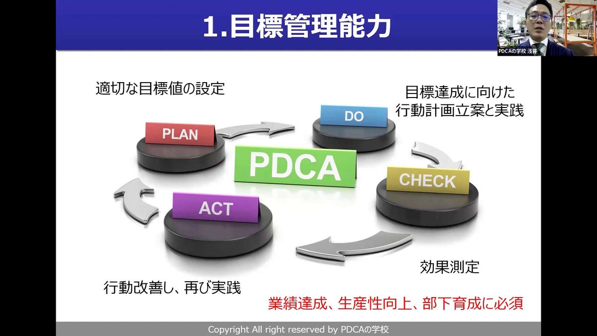 僕たちの社名にもなっていますが、PDCAをしっかり回す能力は、業績を上げる、生産性を上げる、部下のキャリアをつくる、部下を育てるなど、あらゆる場面で非常に大事です。なので、まずは目標管理能力を持っているかどうかが問われます。