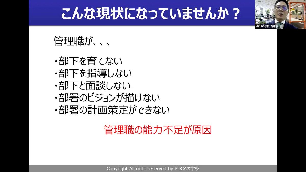 僕たちの研修やコンサルで関わっている企業さまでは、管理職に業績や生産性向上の目標を作らせるだけでなく、部下一人ひとりの成長目標も作らせています。「A君の1年後の成長目標」「B君の1年後の成長目標」といった目標とアクションプランを作り、週1回、もしくは2週に1回の振り返りで検証し、行動を改善していく。こうした管理をしています。