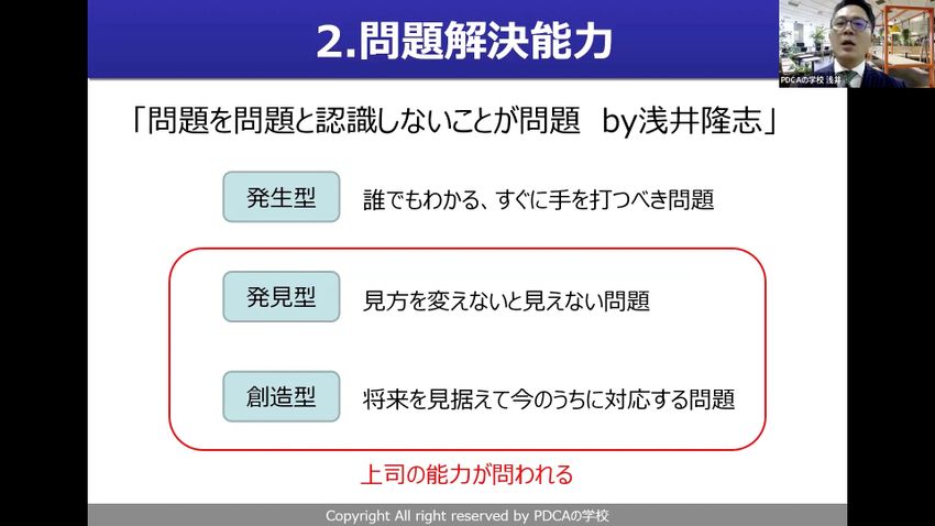 ただ実情として、管理職が目先の業務しか回せていないケースがとても多いと感じています。創造型の問題とは、時間軸を未来に置いて考えることです。「うちの事業は5年後、10年後、このままで生き残れるのか」。経営者は常に考えていますが、管理職にも同じように問題解決のマインドを持ってもらう必要があります。もちろん、ここにはさまざまな知識やスキルも必要です。