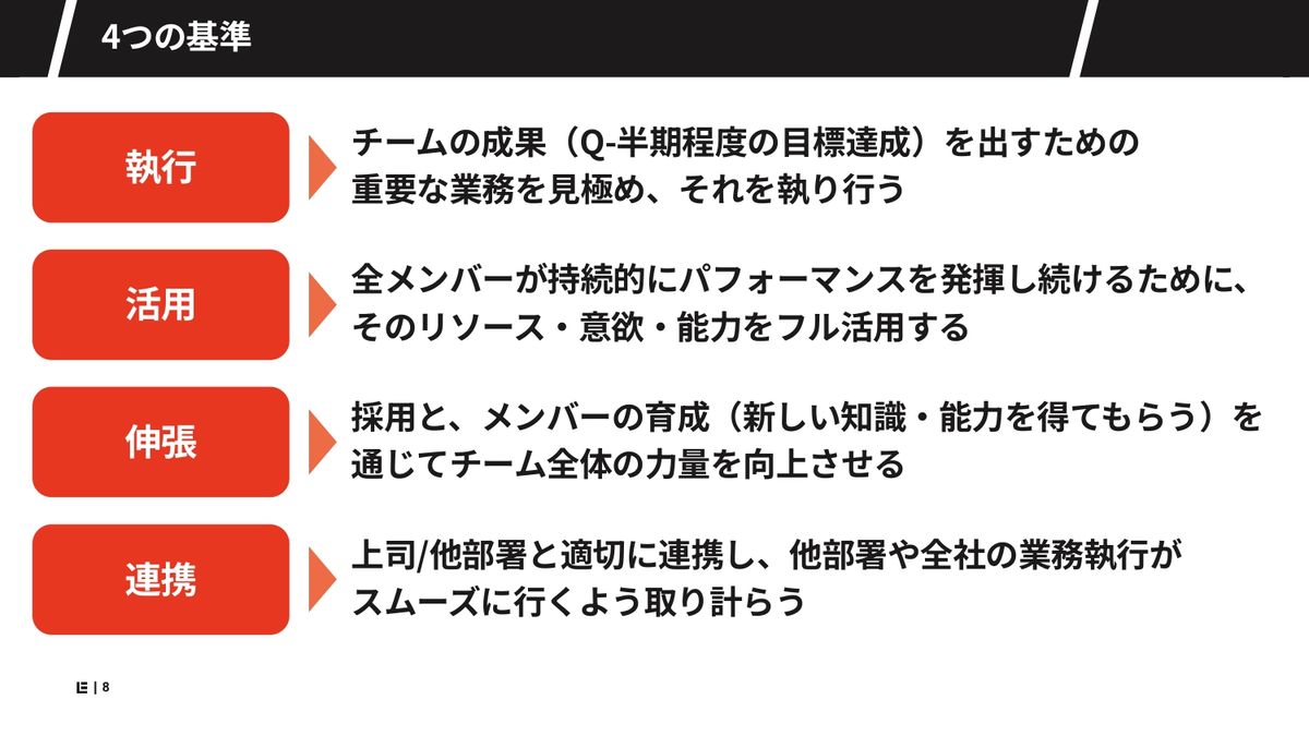 この「執行」「活用」「伸張」「連携」、4つの基準でマネージャーはマネジメントができているかどうかを評価されるべきだと私は考えています。