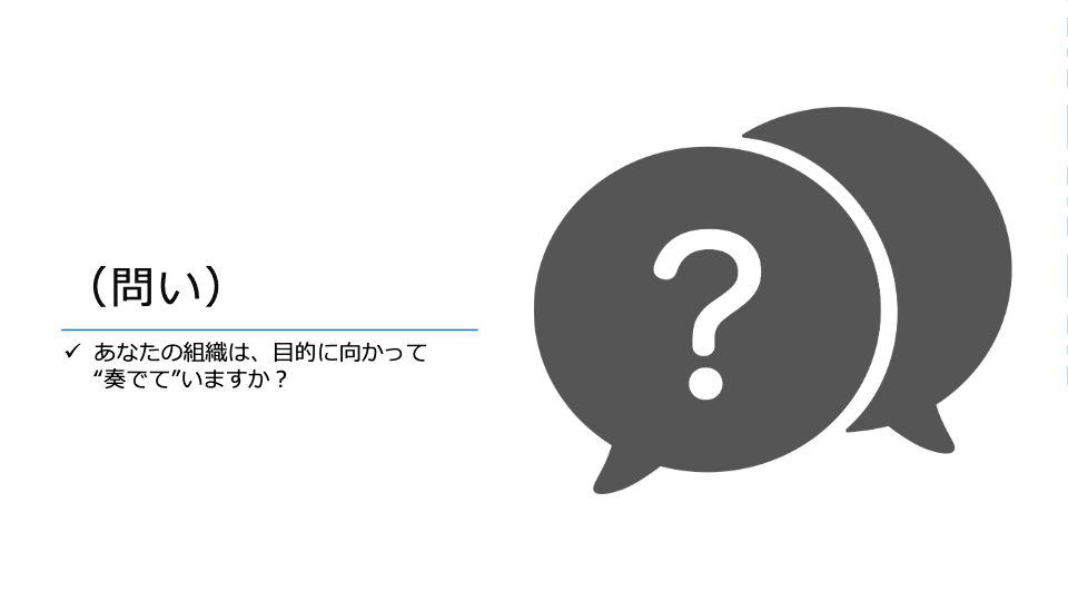 今回のセクションはちょっと短いですが、ここでまたみなさまに問いを投げさせてください。今のお話を踏まえて、「あなたの組織は目的に向かって奏でていますか」。どちらのかたちであっても、目的に向かっていれば、何か音を奏でているんじゃないかなと思います。