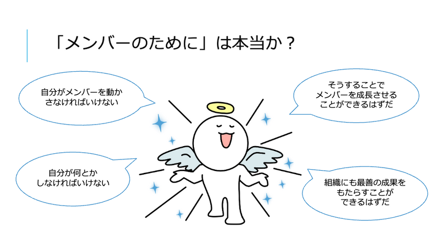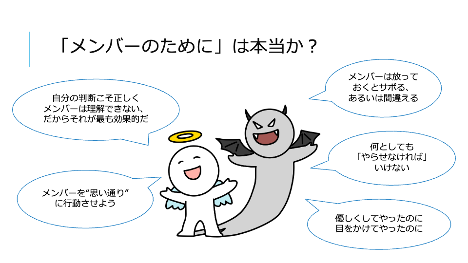 (スライドを示して)右側のイラストで、天使と悪魔が喧嘩をしていますが「メンバーのためだ」「いやいや、でも本当は自分の考えが正解だって言ってんじゃないの」みたいな、なんかちょっと喧嘩状態になってしまって、今自分がどういう状態なのかになかなか気づけなくなってしまっていることもあるんじゃないかなと。