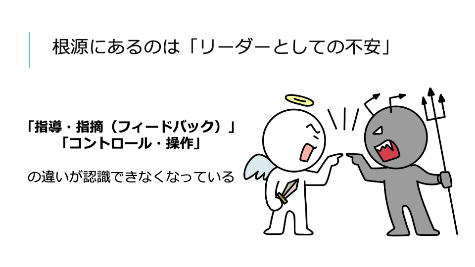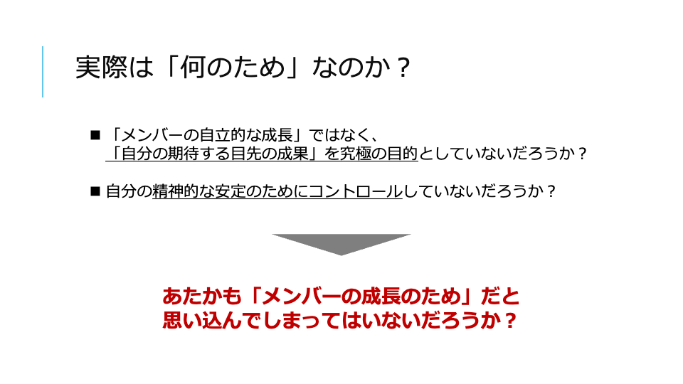 メンバーのためとは言っているけれど、実際は何のためなのかというところをよくよく考えてみると、メンバーの自律的な成長だけではなくて、自分の期待する目先の結果、目先の成果を究極の目的としてないだろうか。自分の精神的な安定のためにコントロールしてないだろうか。結果的にあたかもそれをメンバーの成長のためだと思い込んでしまってはいないだろうかという点です。
