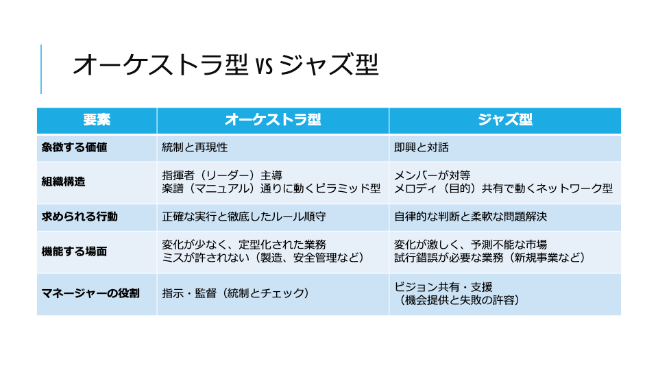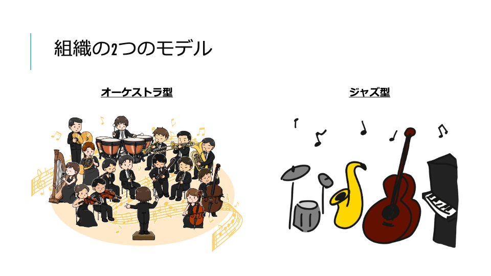(スライドを示して)オーケストラ型とジャズ型、音楽のオーケストラとジャズを、そのまま思い浮かべていただければ大丈夫です。象徴する価値としては、オーケストラ型は統制と再現性、ジャズ型は即興と対話という、それぞれの音楽の特徴そのものかなと思います。
