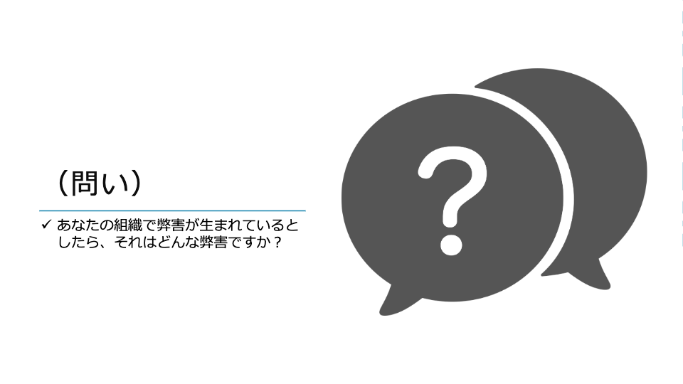筒井千晶氏:じゃあ1つ目の問いです。「あなたの組織で今弊害が生まれているとしたら、それはどんな弊害だと思いますか」。頭の中で何かいろいろ思い浮かんだこととかあると思いますので、「あぁそうか、自分はそんなふうに感じてたんだなぁ」とか、気に留めていただけるといいんじゃないかなぁと思います。