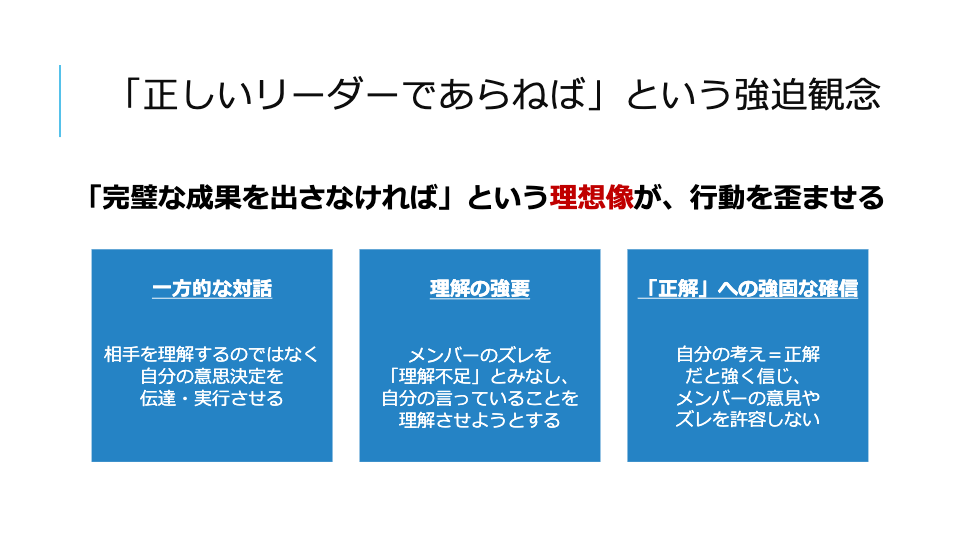 あとは、正解への強固な確信ということで、自分の考えが正解だと強く信じて、メンバーの意見やずれを許容しないこと。自分の世界の中にいて、そこの世界の中にメンバーを連れてこようとするような、そんな行動になってしまっているんじゃないかなと思います。