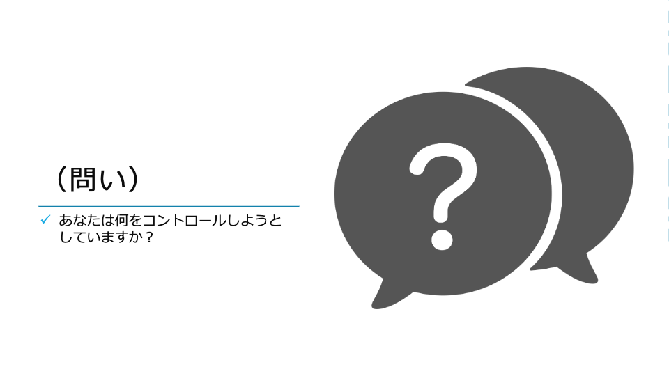 またみなさまに問いを投げさせてください。「あなたは何をコントロールしようとしていますか」。このあたり、いろいろなことに追われていたり、やらなければいけないこともあったりすると見失いがちだと思いますので、どこかで思いをはせていただけるといいんじゃないかなと思います。