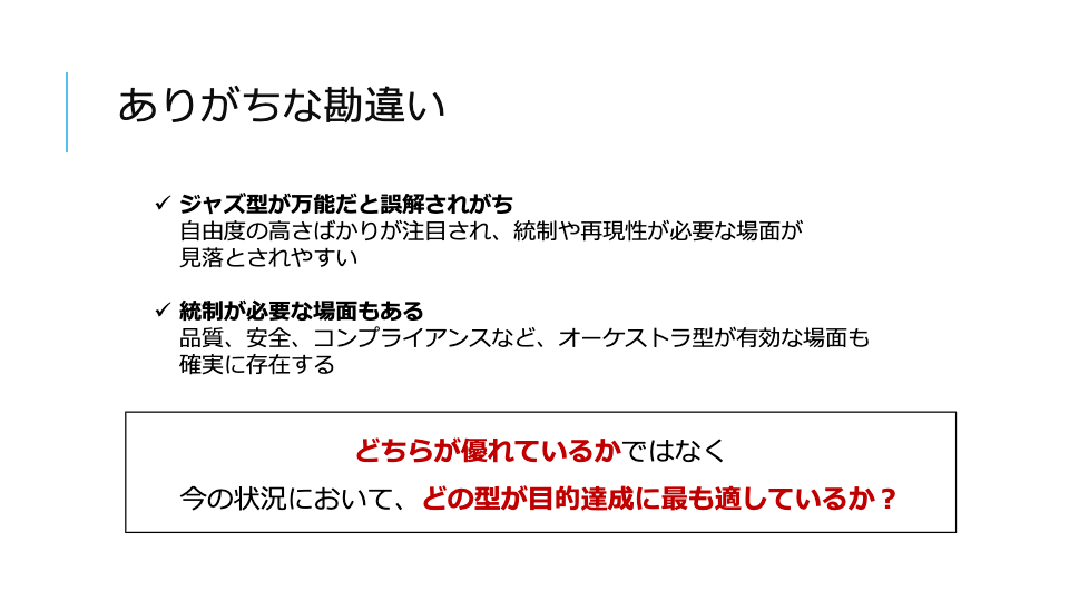 あと2つ目、統制が必要な場面も絶対あります。品質、安全、コンプライアンスなど。他にもあると思いますが、オーケストラ型が有効な場面も確実に存在はします。でもここの部分がなぜか削ぎ落とされて「やっぱりこれからはジャズ型だよね」と言われているような、そんな印象をとても持っています。