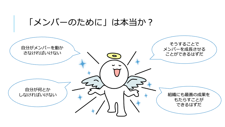 「メンバーのために自分がなんとかしなければいけない」「自分がメンバーを動かさなければいけない。そうすることでメンバーを成長させることができるはずだ。そして、組織にも最善の成果をもたらすことができるはずだ」という言い方ですが……。