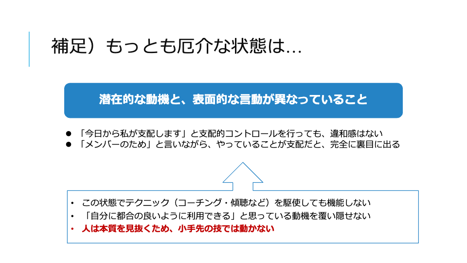 指導が良くてコントロールがダメという話ではなくて、どちらの状態にあるのかということをまず区別するっていうことがすごく大事だと思っています。なぜかというと、最も厄介な状態は、潜在的な動機と表面的な言動が異なっている状況だからです。例えば「今日から私が支配します」と言って支配的コントロールを行ったとしたら、当然(メンバーは)嫌だとは思いますが、違和感はないんじゃないかなという気がしています。