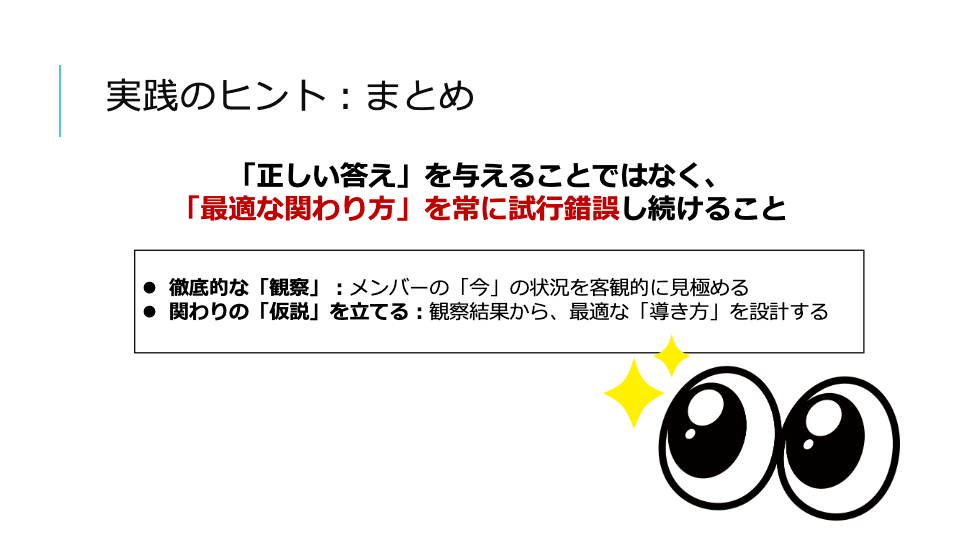 このセクションのまとめですが、いろいろこういうやり方やこういう関わり方をお伝えをしましたが、正しい答えを与えるのではなくて最適な関わり方を常に試行錯誤し続けることが実践においてはすごく大切かなと思っています。