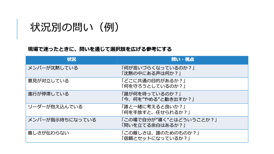 メンバーが指示待ちになっている。こんな時は、「この場で自分が導くとはどういうことか」とか、「問いを立てる余白はあるのか」。つまりは、問いを投げてみて指示待ちは解消されるんだろうかということを1回ちょっと立ち止まって考えてみたりするのもいいかなと思います。