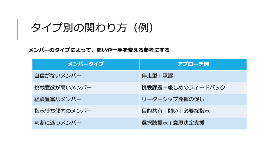 あともう1つ。これも参考までにですが、先ほど状況やメンバーのタイプによって関わり方は変わりますとお伝えをしました。ここに書いてあることは、こういうメンバーにはこれが有効ですよというよりも、アプローチの例として受け取っていただければと思います。