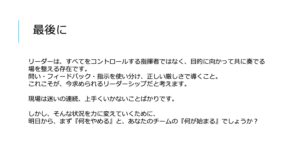 問い・フィードバック・指示を使い分けて、正しい厳しさも意識しながら導いていく。それが今、求められるリーダーシップなんじゃないかなと私個人は考えています。現場は本当に迷いの連続ですし、うまくいかないことばかりだと思います。ただ、そういった状況を力に変えていくために、明日からまず何をやめるとあなたのチームの何が始まるのでしょうか。