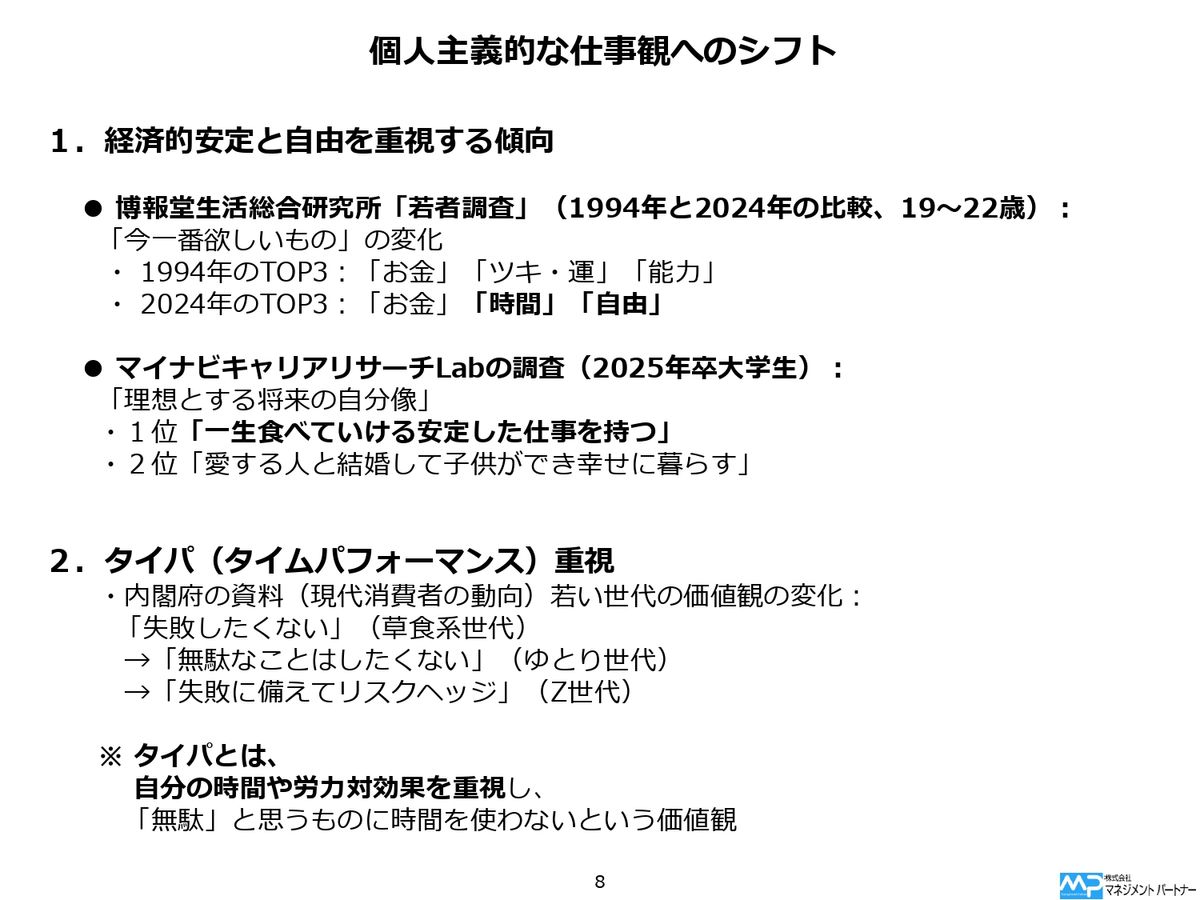 2つ目、タイムパフォーマンスを重視する傾向。(スライドを示して)これは内閣府の調査ですが、若い世代の価値観が、この調査の定義で言うところの草食系世代。1982年から1987年生まれの「失敗したくない」という価値観から、1988年から1994年生まれのゆとり世代は「無駄なことはしたくない」。1995年から2003年生まれのZ世代は、「失敗に備えてリスクヘッジ」と、どんどん自分の時間対効果を重視している傾向が強くなってるなと。