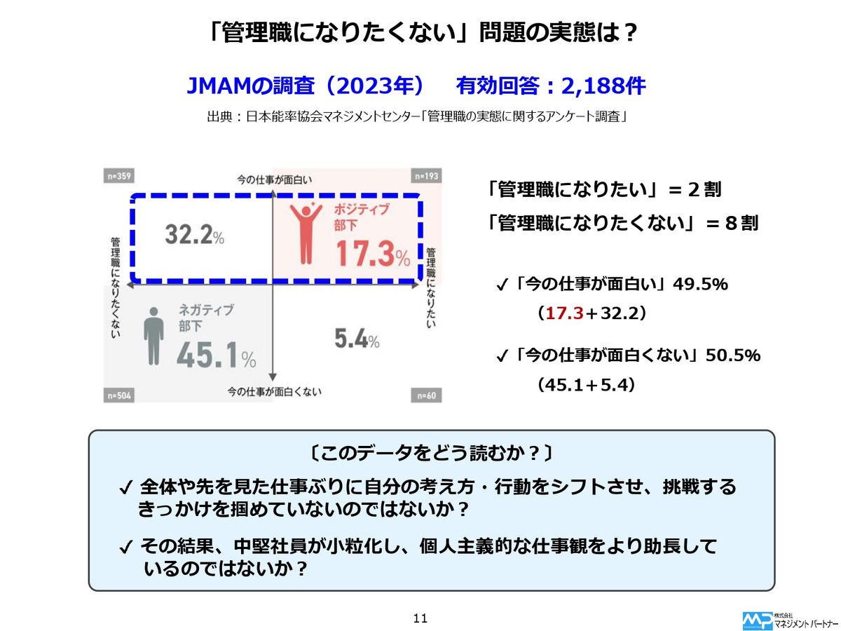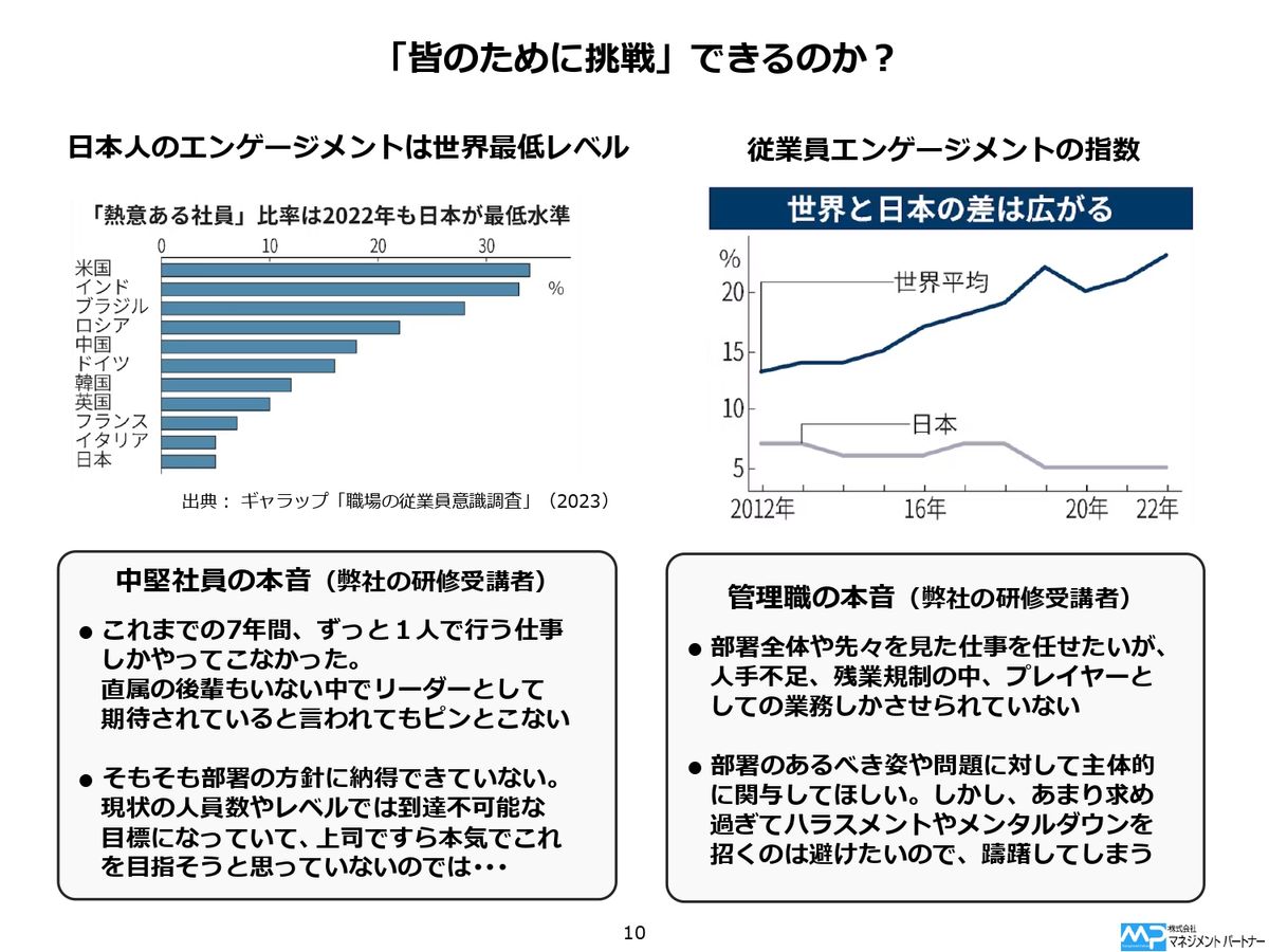 しかも諸外国に比べて、ここ10年ぐらいで顕著にそれが開いてきているという内容です。実際、私どもが(実施した)ここ数年の中堅社員研修や中堅社員をメンバーに持つ管理職の研修で出てきた、ご受講された方々の本音をうかがっても、この調査が裏付けられてるなぁと感じます。