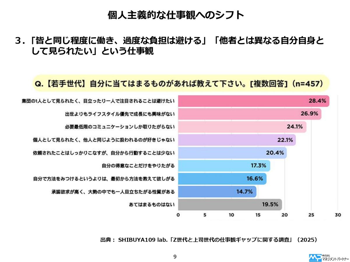3つ目に、みんなと同じ程度に働き、過度な負担は避ける。一方で、他者とは異なる自分自身として見られたい。こういう仕事観を見ますと、みんなと同じ程度に働き、過度な負担を避けたいと。(そのような傾向が)非常に強いんですよね。ただそれと同時に、私個人として見てもらいたい、承認されたいという存在意義を求める傾向も強い。