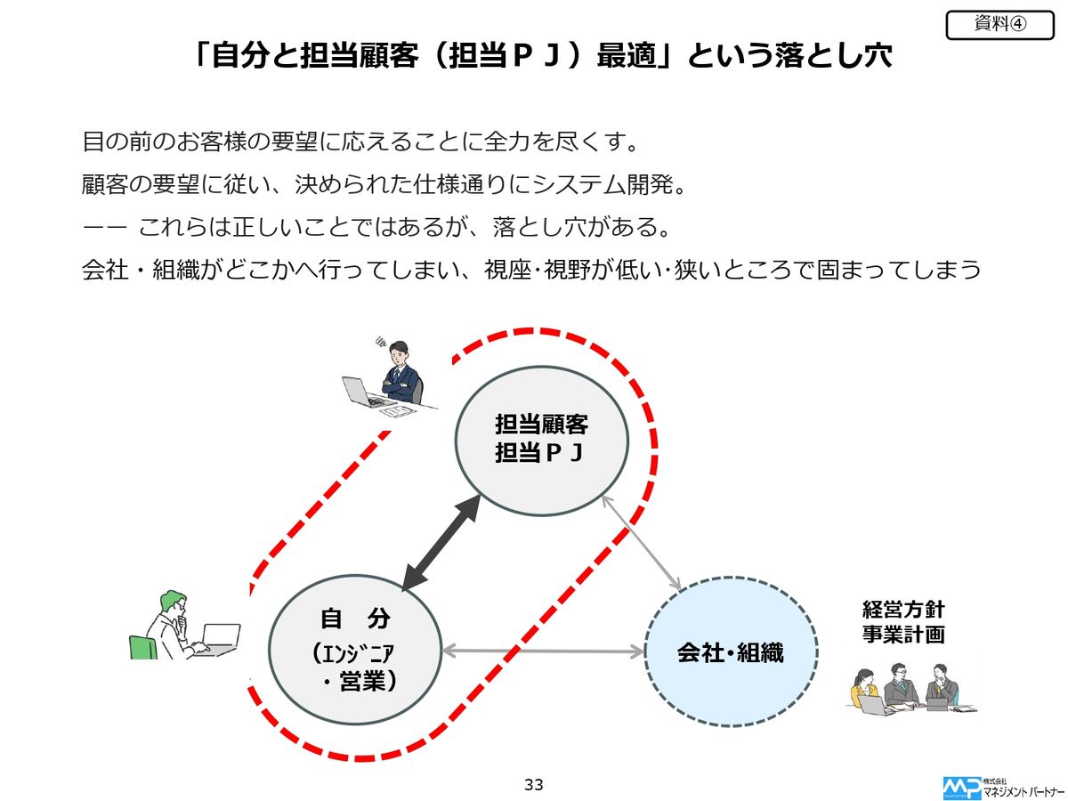 目の前のお客さんのご要望に従って、決められた仕様どおりにシステム開発する。これが仕事のほとんど100パーセントです。それ自体は間違ってないんですけれども、そういう仕事に没頭するあまり、「そもそも自分はどこに所属していて、どういう貢献が求められるのか」っていう視点がどっかへいってしまって、結果、視座が低く、視野が狭いというところで固まってしまうんです。