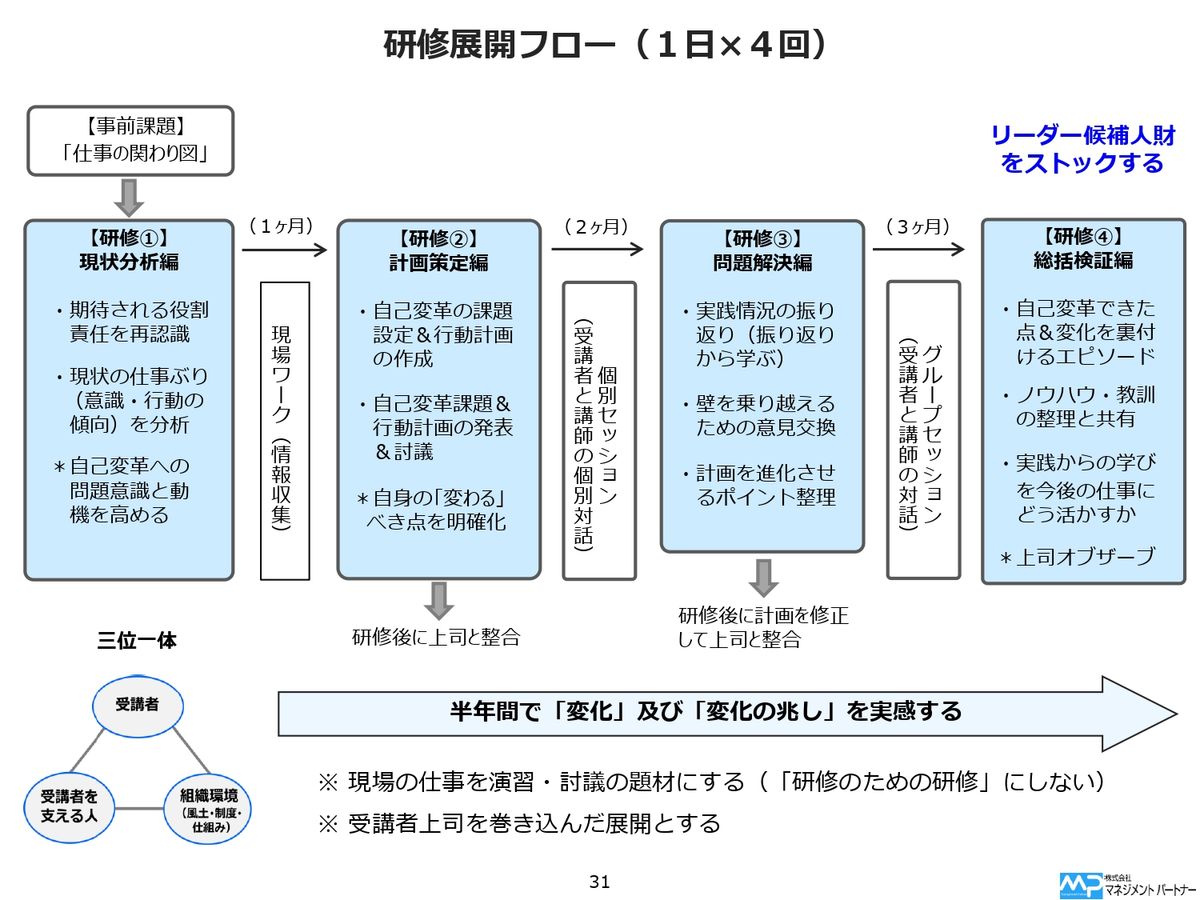 研修による習得ポイントは、全体俯瞰的なものの見方、先読みして周囲を巻き込んでいくための自己革新の課題を設定、その方針実現の方向で率先行動を取るということです。この研修ですが、会社の目標管理とも連動させて、より実務に直結した内容にしました。